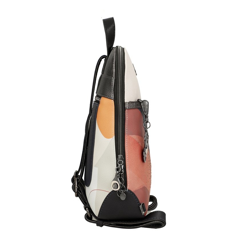 Elegantní batoh má jedno ucho do ruky a nastavitelné popruhy na záda. Na přední i zadní straně jsou kapsy na zip. Batoh má zapínání na zip. Uvnitř je kapsa na zip a dvě otevřené kapsičky. Součástí batohu je ozdobný přívěšek. Batoh je balený v ochranném obalu.