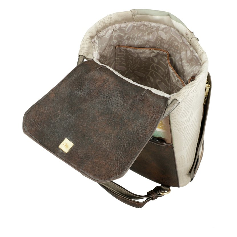 Batoh má jedno ucho do ruky a nastavitelné popruhy na záda. Na zadní straně je malá kapsa na zip. Batoh má z boku dvě kapsy s šikmým zipem. Batoh má v horní části klopnu s kovovým zapínáním. Hlavní prostor batohu se zavírá stahovací šňůrou. Uvnitř batohu je kapsa na zip a dvě otevřené kapsičky. Batoh je balený v ochranném obalu.