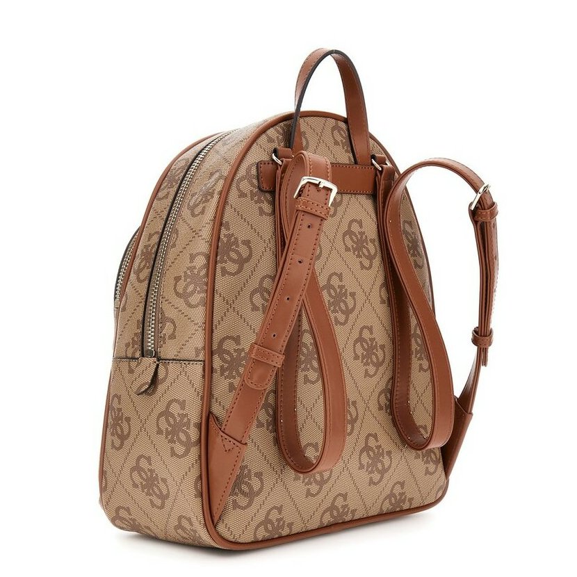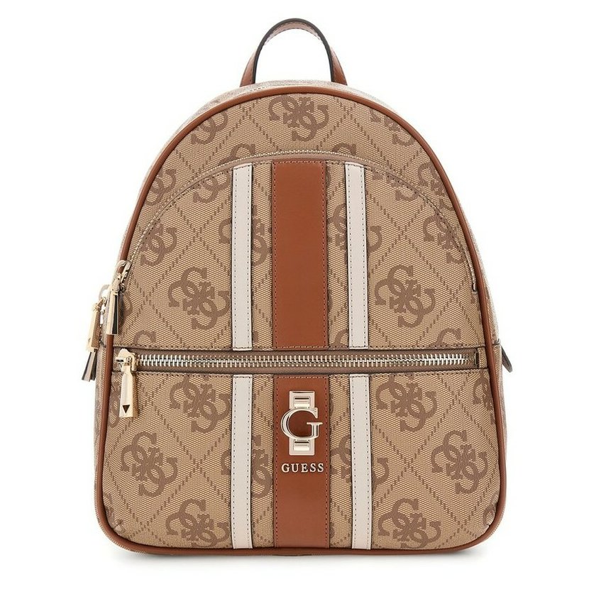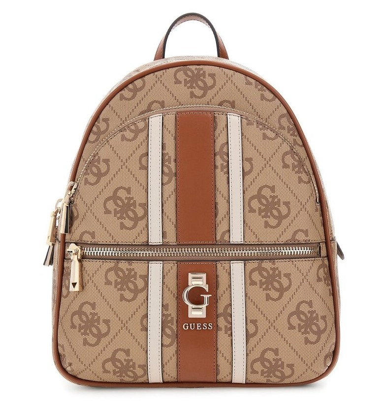 Velký batoh má jedno ucho do ruky a nastavitelné popruhy na záda. Na přední straně je menší kapsa na zip a větší kapsa na zip. Batoh má zapínání na zip. Uvnitř je kapsa na zip a dvě otevřené kapsičky. Kovové komponenty mají zlatou barvu. U kabelky je ochranný pytlík s logem Guess.