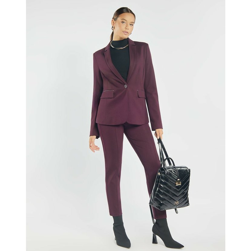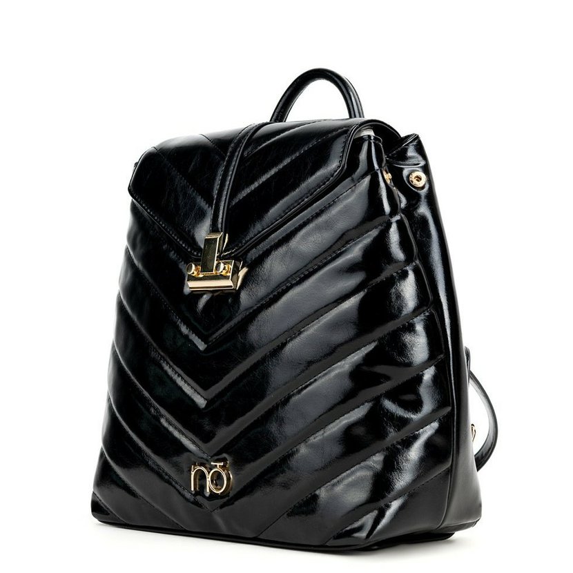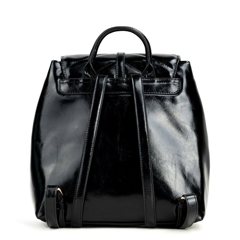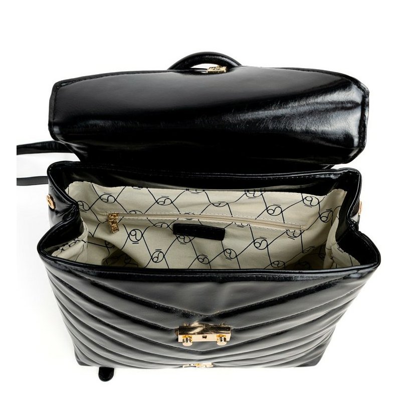 Batoh má klopnu s kovovým zapínáním. V horní části (po stranách) jsou druky, pomocí kterých lze batoh nahoře zmenšit nebo zvětšit. Uvnitř batohu je kapsa na zip a dvě otevřerné kapsy. Batoh má pevný tvar. Kovové komponenty mají zlatou barvu. Batoh je balený v ochranném pytlíku.