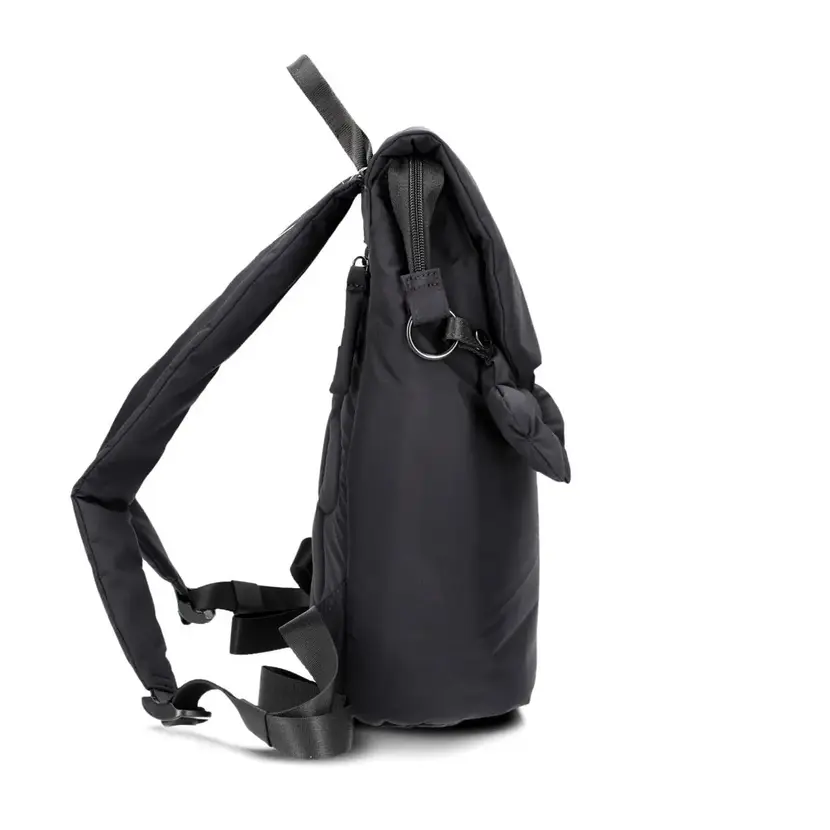 Moderní dámský batoh kombinuje hravou lehkost s promyšlenou funkčností. Tento batoh je vyroben z vysoce kvalitního recyklovaného polyesteru a nabízí nejen elegantní design, ale také praktické funkce jako je vypolstrovaná kapsa na notebook. Materiál batohu je vycpaný, působí tak dojem "péřové bundy". Batoh má jedno krátké ucho do ruky a dva nastavitelné a vyměkčené popruhy na záda. Batoh má vpředu i vzadu kapsy na zip. Horní část batohu je překlopená dopředu a zapíná se na magnety skryté pod materiálem. Batoh má zapínání na zip.