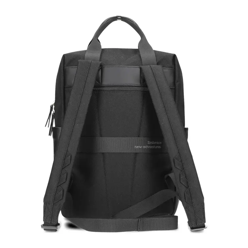 Nádherný a propracovaný batoh má dvě krátká ucha do ruky, která se dají sepnout drukem, a dva nastavitelné a vyměkčené popruhy na záda. Batoh má vpředu skrytou kapsu se zapínáním na zip. V kapse je poutko na klíče. Zadní strana batohu je vyztužená. Na zádech je velká kapsa na zip a popruh, pomocí kterého lze batoh nasadit na držadlo kufru. Na bocích batohu jsou otevřené kapsy na menší láhev s vodou.
