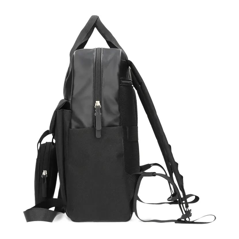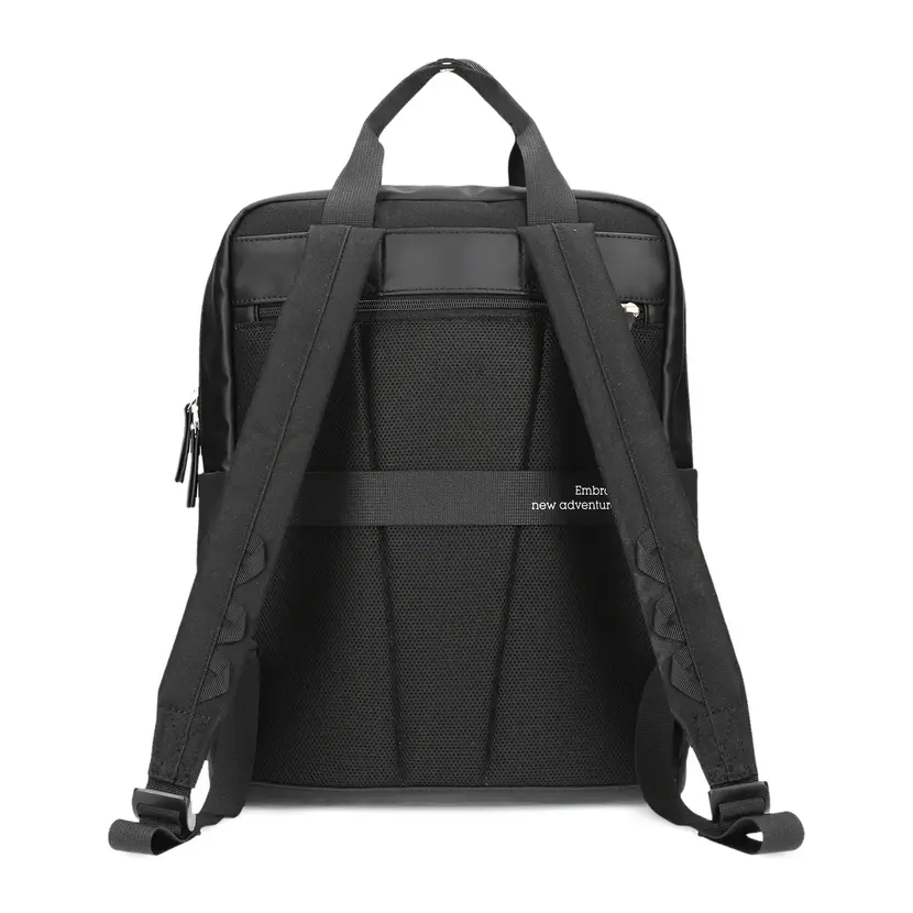 Nádherný a propracovaný batoh má dvě krátká ucha do ruky, která se dají sepnout drukem, a dva nastavitelné a vyměkčené popruhy na záda. Batoh má vpředu velkou kapsu se zapínáním na dva magnety skryté v materiálu. Uvnitř přední kapsy je síťovaná kapsa na zip a poutko na klíče. Zadní strana batohu je vyztužená. Na zádech je velká kapsa na zip a popruh, pomocí kterého lze batoh nasadit na držadlo kufru. Na bocích batohu jsou otevřené kapsy na menší láhev s vodou.