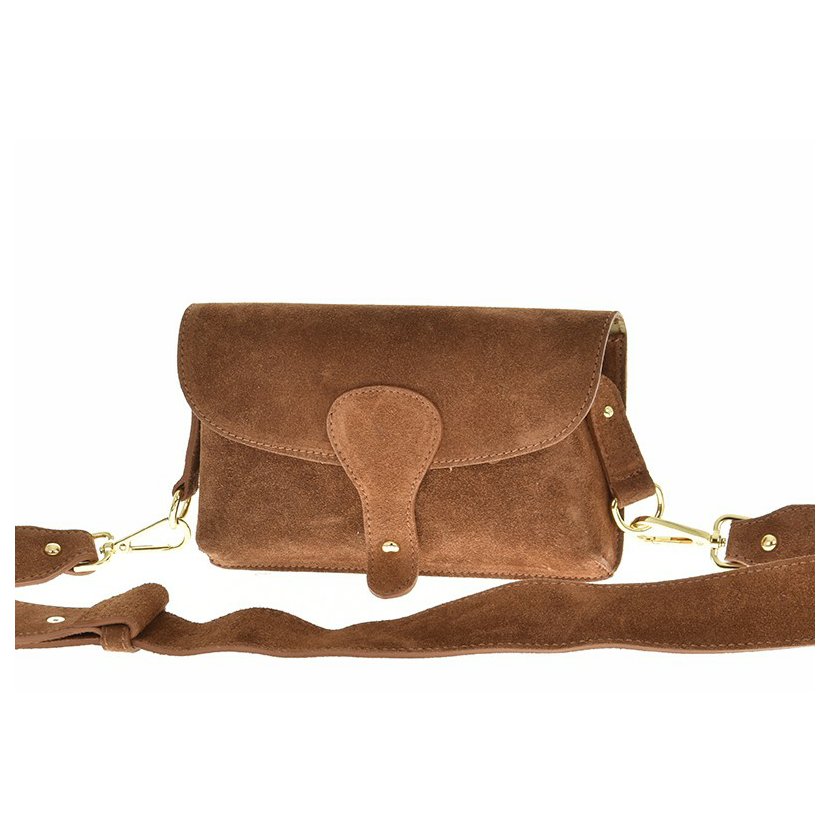 Kožená kabelka je vyrobena z kvalitní italské kůže. Kabelka má pevný tvar. Kabelka má dlouhý, široký, nastavitelný a odnímatelný popruh, takže ji lze nosit v ruce jako psaníčko nebo šikmo přes rameno jako crossbody. Kabelka má klopnu se zapínáním na magnet. Pod klopnou je zapínání na zip. Kovové komponenty mají zlatou barvu.
