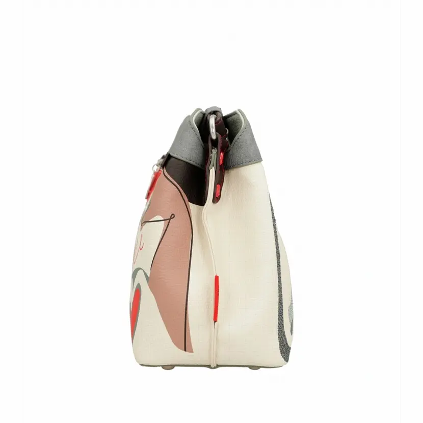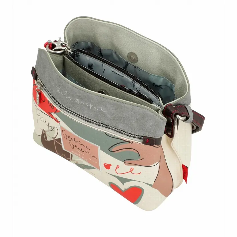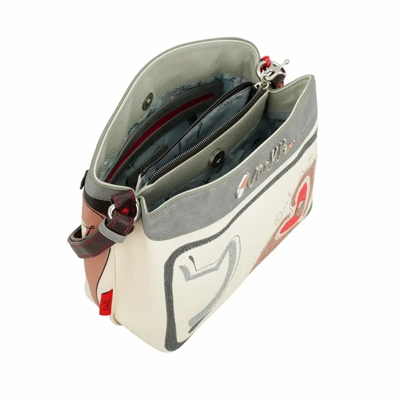Kabelka má dlouhý popruh přes rameno a lze ji tak nosit jako crossbody. Na jedné straně popruhu je řetízek červené barvy o délce 20 cm. Na zadní straně kabelky je kapsa na zip. Kabelka má dvě samostatné komory se zapínáním na magnet. Uprostřed je přepážka, která slouží jako kapsa se zapínáním na zip. Uvnitř kabelky je kapsa na zip a otevřená kapsa. Kabelka je balená v ochranném obalu.