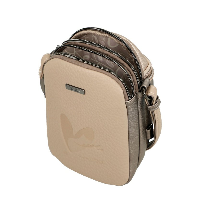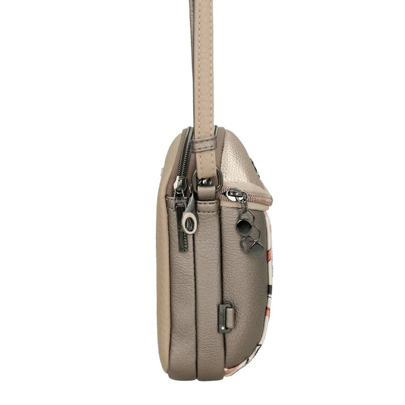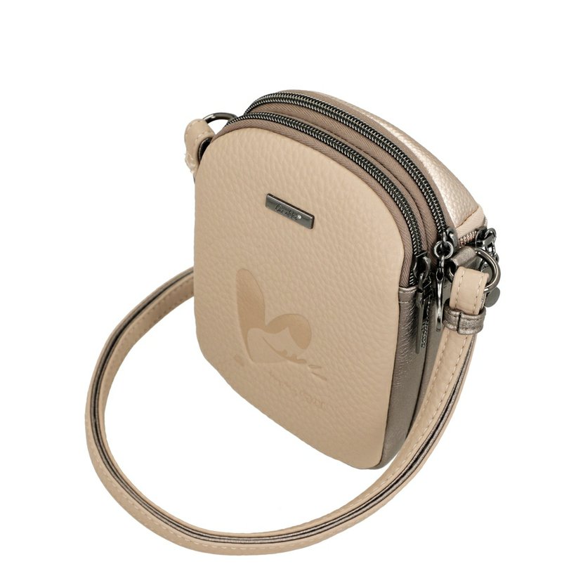 Menší crossbody kabelka má dlouhý nastavitelný popruh a lze ji nosit šikmo přes rameno jako crossbody. Na přední straně je kapsa na zip. Kabelka má dvě komory. Každá komora má zapínání na zip. Kabelka je balená v ochranném obalu.