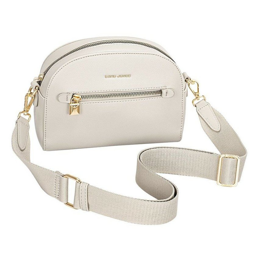 Kabelka má dlouhý, nastavitelný popruh přes rameno a lze ji tak nosit šikmo přes rameno jako crossbody. Na přední straně kabelky je kapsa na zip. Kabelka má zapínání na zip. Uvnitř kabelky je pevná šedá podšívka, kapsa na zip a otevřená kapsička. Kovové komponenty mají zlatou barvu. Kabelka má pevný tvar.
