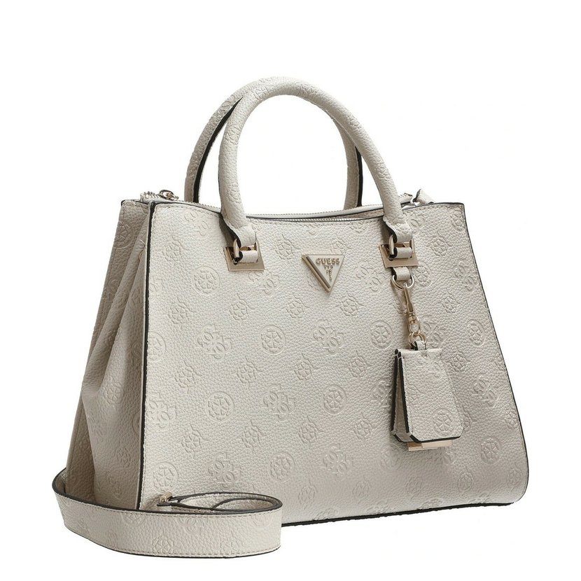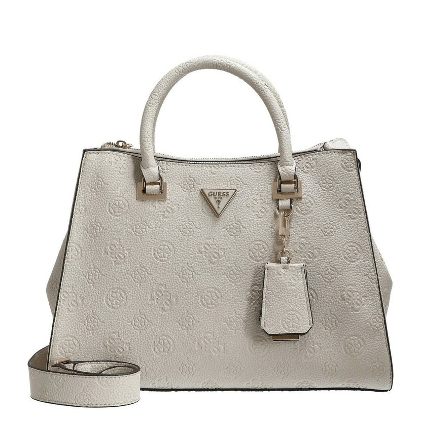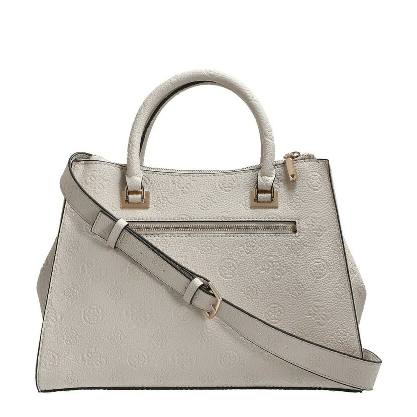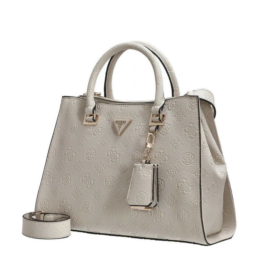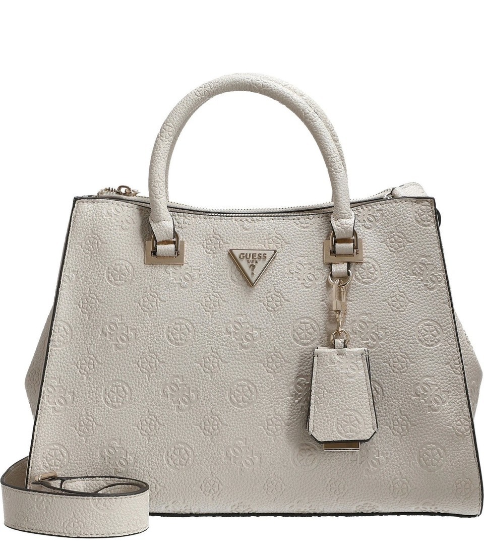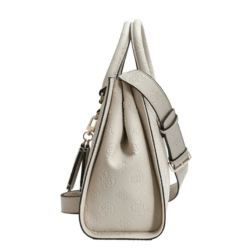 Nádherná kabelka má dvě ucha do ruky a přídavný, nastavitelný a odnímatelný popruh přes rameno. Na zadní straně je kapsa na zip. Kabelka má dvě komory, každá se zapínáním na zip. Uvnitř kabelky je kapsa na zip a dvě otevřené kapsičky. Po stranách kabelky (nahoře) jsou druky, které lze sepnout a kabelka tak změní tvar. Kovové komponenty mají zlatou barvu. U kabelky je ochranný pytlík s logem Guess.