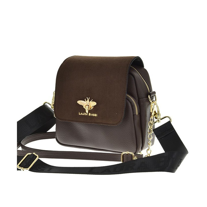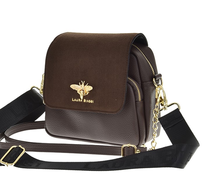Kabelka má dva dlouhé a vyměnitelné popruhy - široký, látkový a nastavitelný popruh a tenký, řetízkový a nastavitelný popruh. Kabelku tak lze nosit v ruce jako psaníčko nebo šikmo přes rameno jako crossbody. Kabelka má na zadní straně kapsu na zip. Kabelka má klopnu s ozdobným kovovým zapínáním. Hlavní prostor kabelky má zapínání na zip. Uvnitř kabelky je červená podšívka a kapsa na zip. Na přední straně je ještě další kapsa na zip. Kovové komponenty mají zlatou barvu. Materiál klopny připomíná semiš.