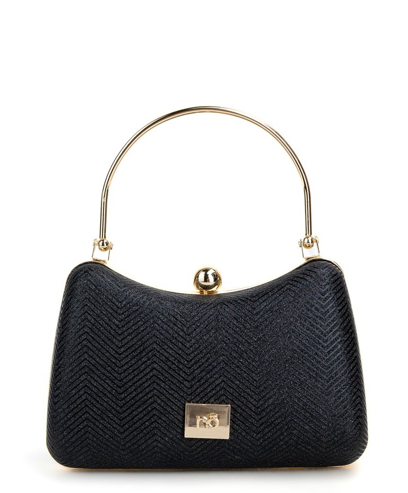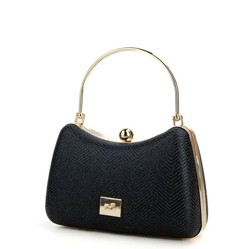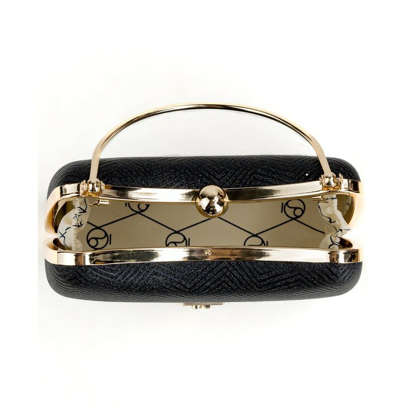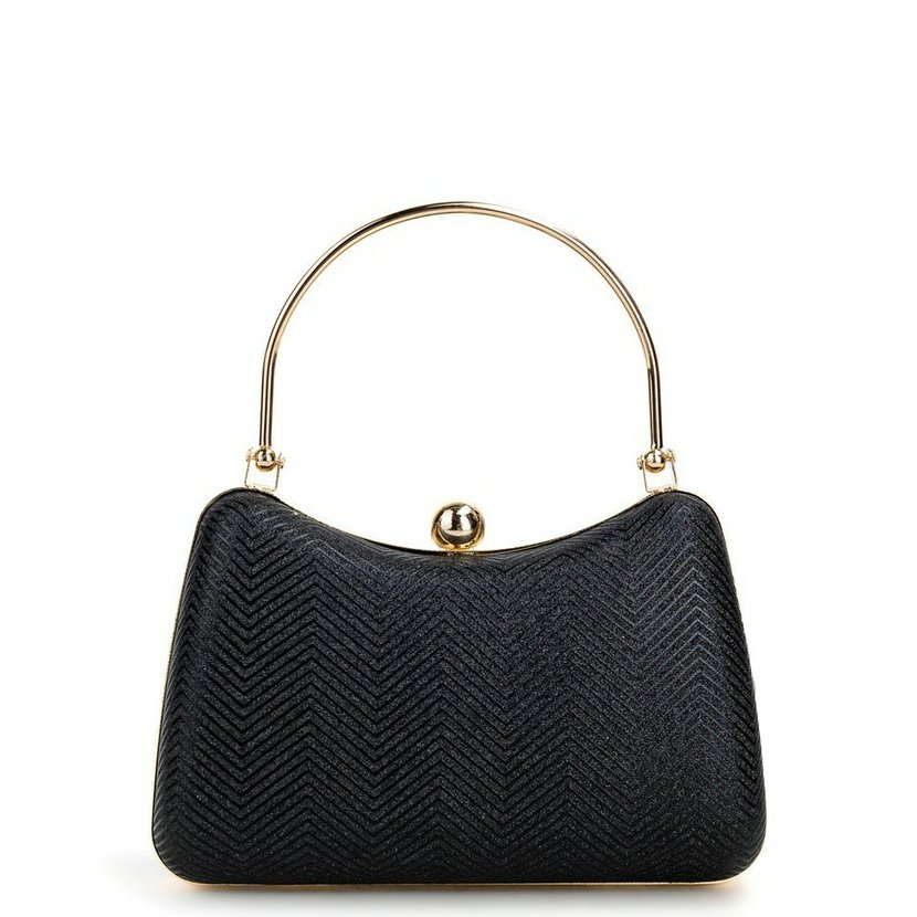 Společenská kabelka má kovové držadlo do ruky a přídavný řetízek přes rameno. Kabelka má kovové zapínání. Kabelka má pevný tvar. Kovové komponenty mají zlatou barvu. Kabelka je balená v ochranném pytlíku.