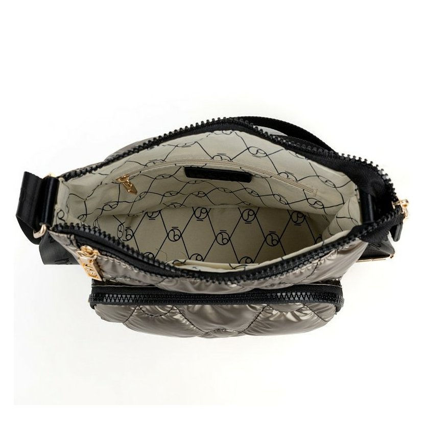Kabelka má dlouhý a nastavitelný popruh přes rameno. Kabelku tak lze nosit šikmo přes rameno jako crossbody. Na přední straně je větší kapsa na zip a menší kapsa na zip. Kabelka má zapínání na zip. Uvnitř kabelky je kapsa na zip a otevřená kapsa. Kovové komponenty mají zlatou barvu. Kabelka je balená v ochranném pytlíku.