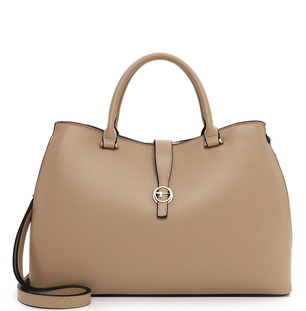 Větší kabelka ve stylu kufříku má dvě pevná ucha do ruky a dlouhý, odnímatelný a nastavitelný popruh přes rameno. Kabelka má tři samostatné komory. Prostřední (hlavní) komora má zapínání na zip. Přední komora má zapínání na magnet a pásek, zadní komora má zapínání na magnet. Hlavní komora má uprostřed přepážku, která rozděluje prostor uvnitř kabelka na dvě části. Přepážka má zapínání na zip a slouží jako kapsa. Uvnitř je dále pevná podšívka, kapsa na zip a otevřená kapsa. Kovové komponenty mají světle zlatou barvu. Kabelka má pevný tvar.
