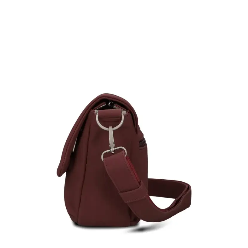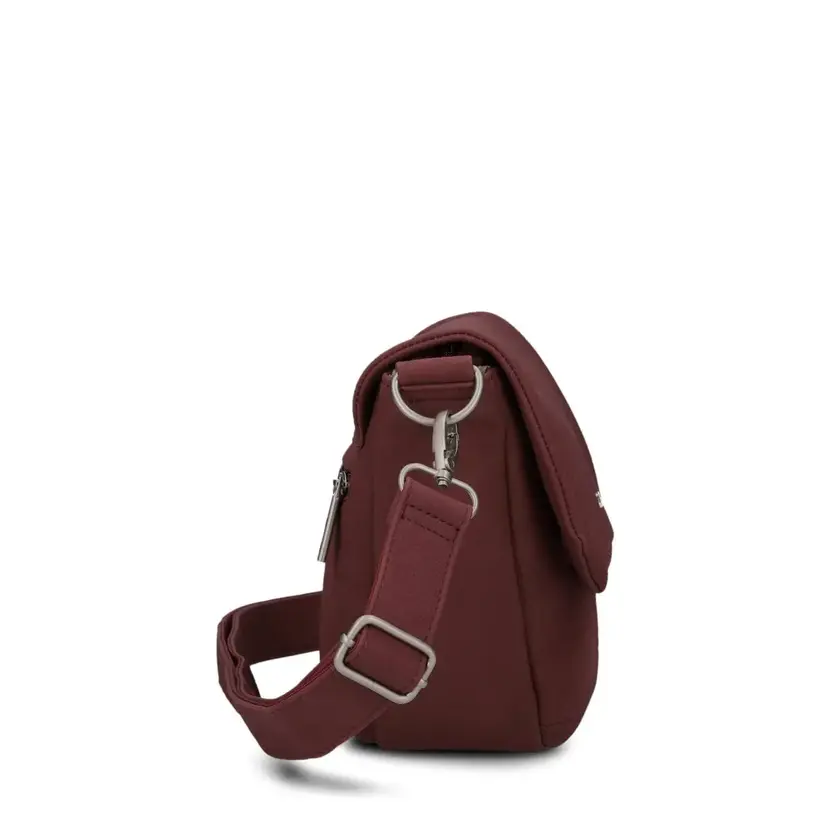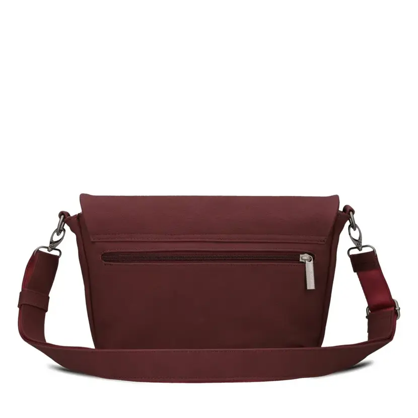 Kabelka má kratší, odnímatelný popruh a dlouhý, odnímatelný a nastavitelný popruh. Kabelku tak lze nosit na rameni nebo šikmo přes rameno jako crossbody. Na zadní straně je kapsa na zip, na přední straně pod klopnou je další kapsa na zip. V přední kapse je karabinka na klíče na dlouhé šňůrce. Kabelka má klopnu, která se zapíná pomocí dvou magnetů skrytých v materiálu kabelky. Uvnitř kabelky jsou dvě otevřené a vyměkčené kapsičky a kapsa na zip. Kovové komponenty mají matnou bílou barvu.
