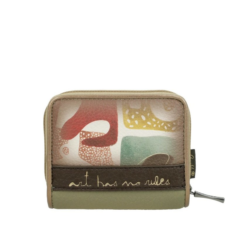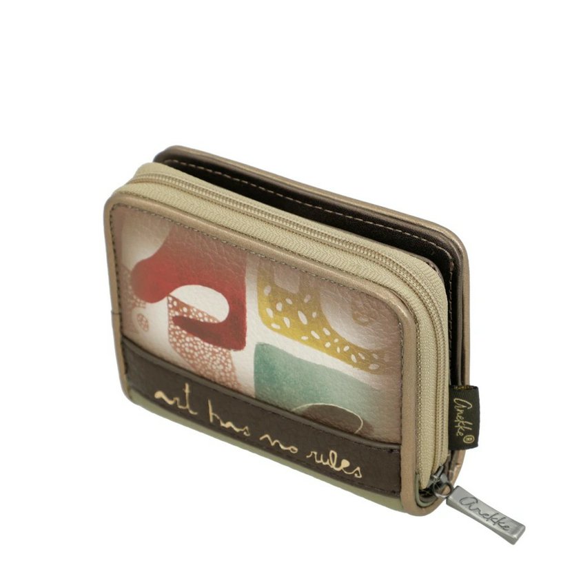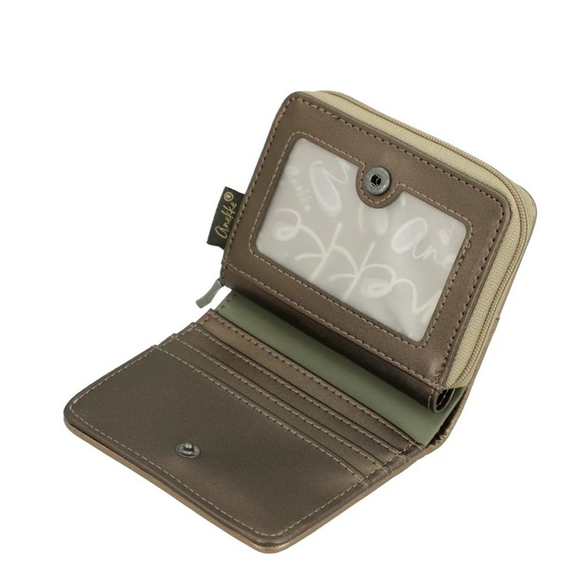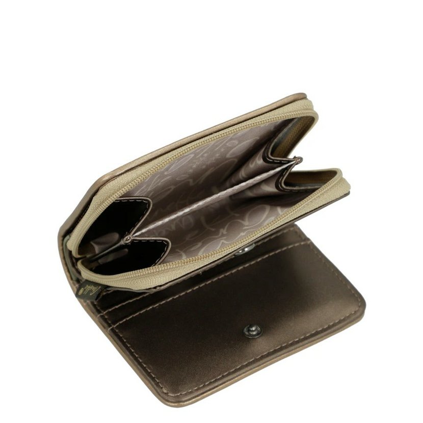 Malá peněženka má dva oddíly. Kapsa na zip má přepážku a lze ji použít na mince nebo složené bankovky. Druhý oddíl má zapínání na druk. Uvnitř je podélná kapsa na bankovky a 5 záložek na karty nebo doklady (jedna záložka je průhledná). Peněženku dodáváme v originální krabičce.