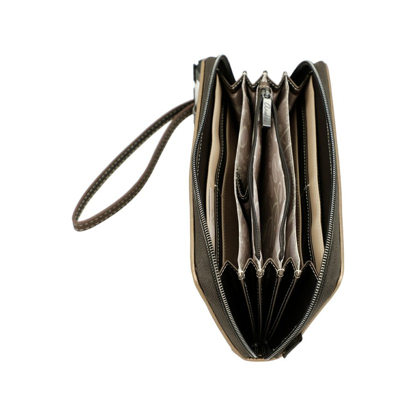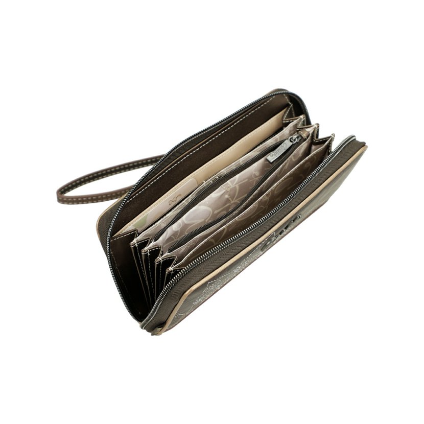 Větší peněženka má zip ze tří stran. Na vnější straně je malá kapsička na zip. Uvnitř peněženky jsou 4 podélné kapsy bez zipu na bankovky, zipová kapsička na mince, 2 přihrádky na doklady a 8 záložek na karty. Peněženku dodáváme v originální krabičce.