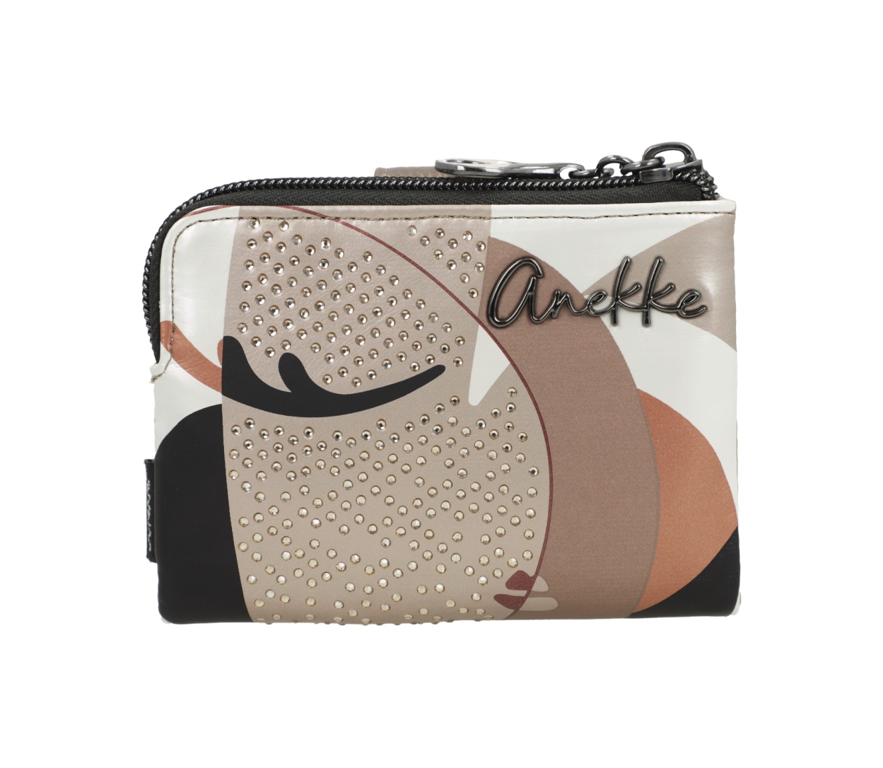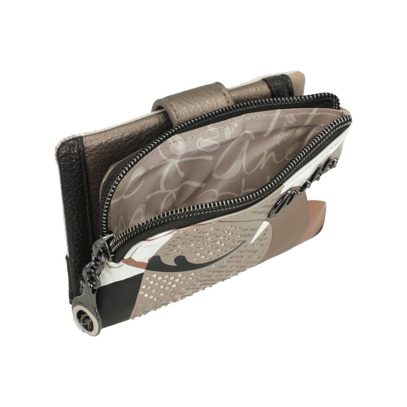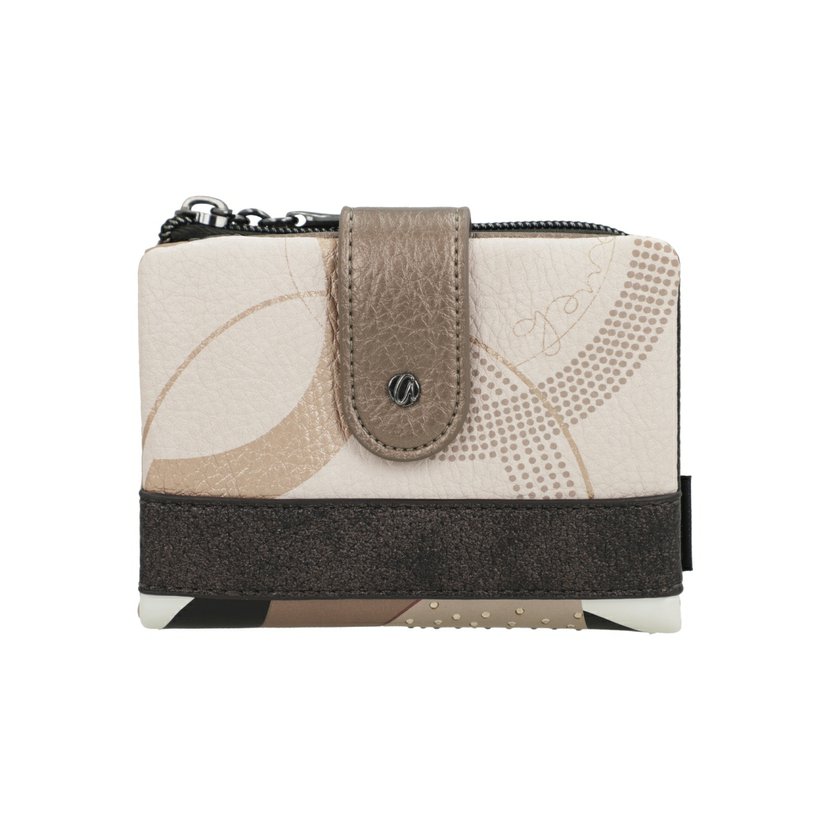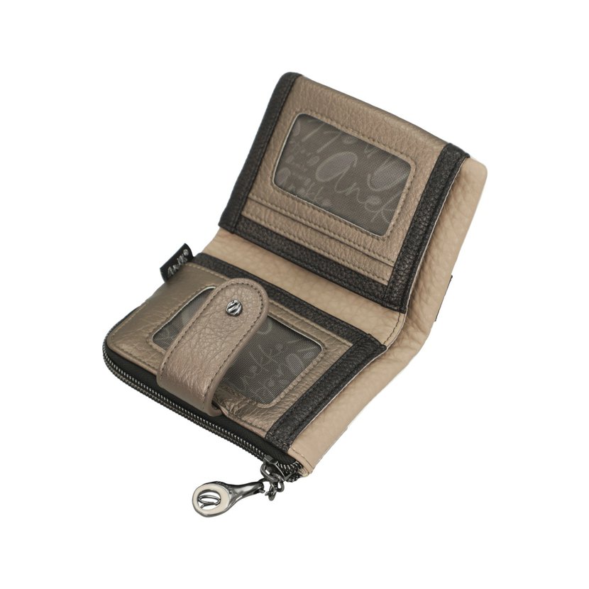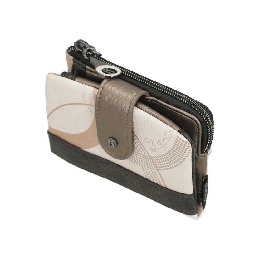 Menší peněženka má zapínání na druk. Uvnitř je přihrádka na bankovky, velká zipová kapsa na další bankovky nebo papíry a 5 záložek na karty (2 záložky jsou průhledné). Z vnější strany je zipová kapsa na mince. Peněženka je balená v papírové krabičce.