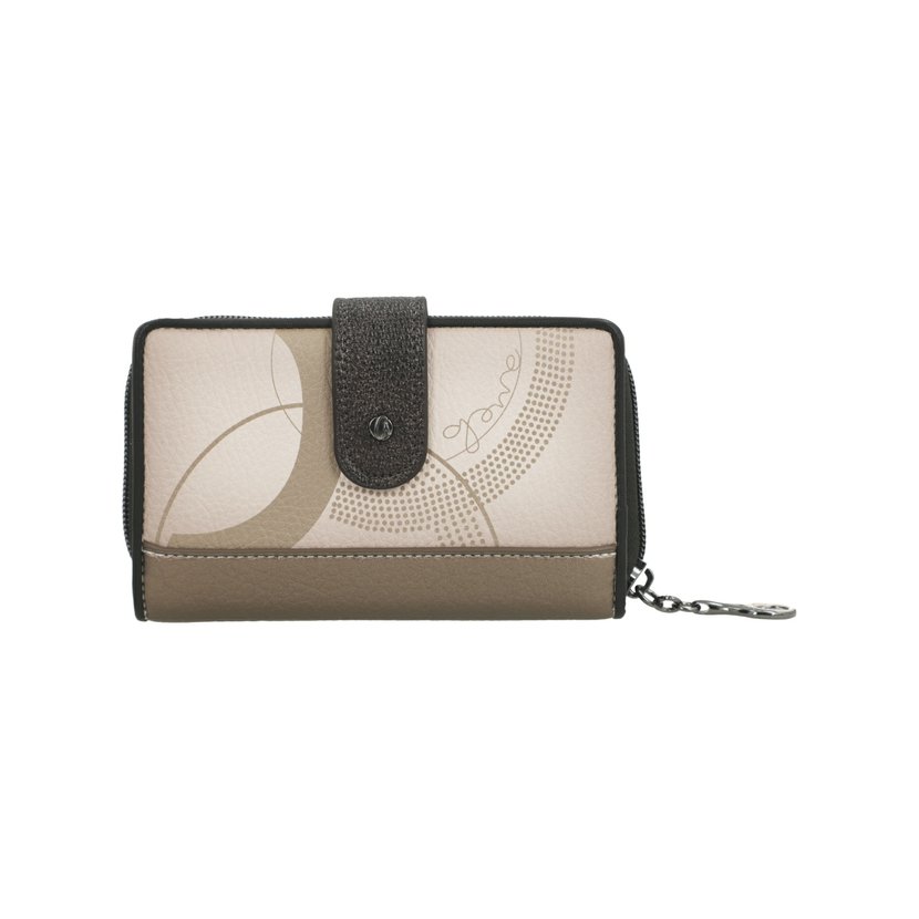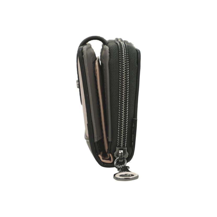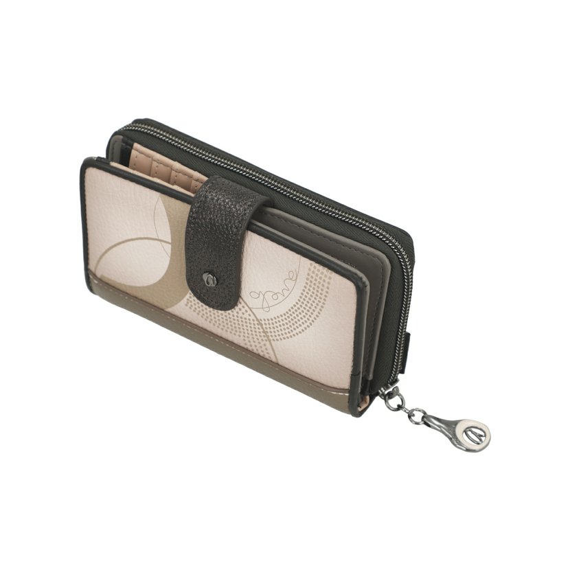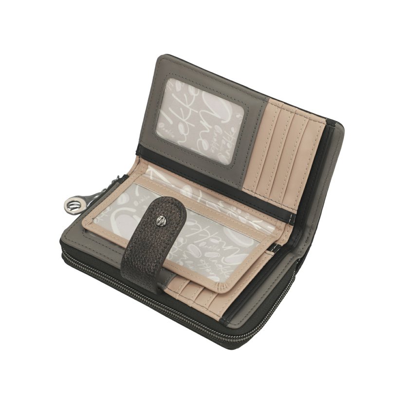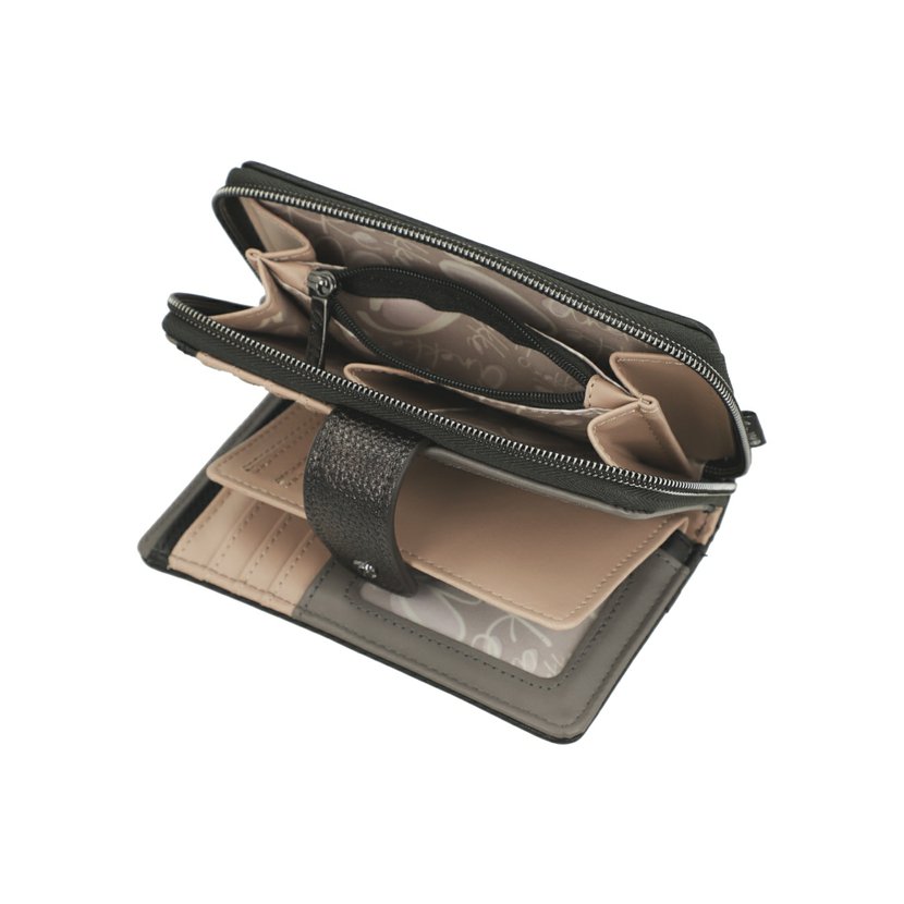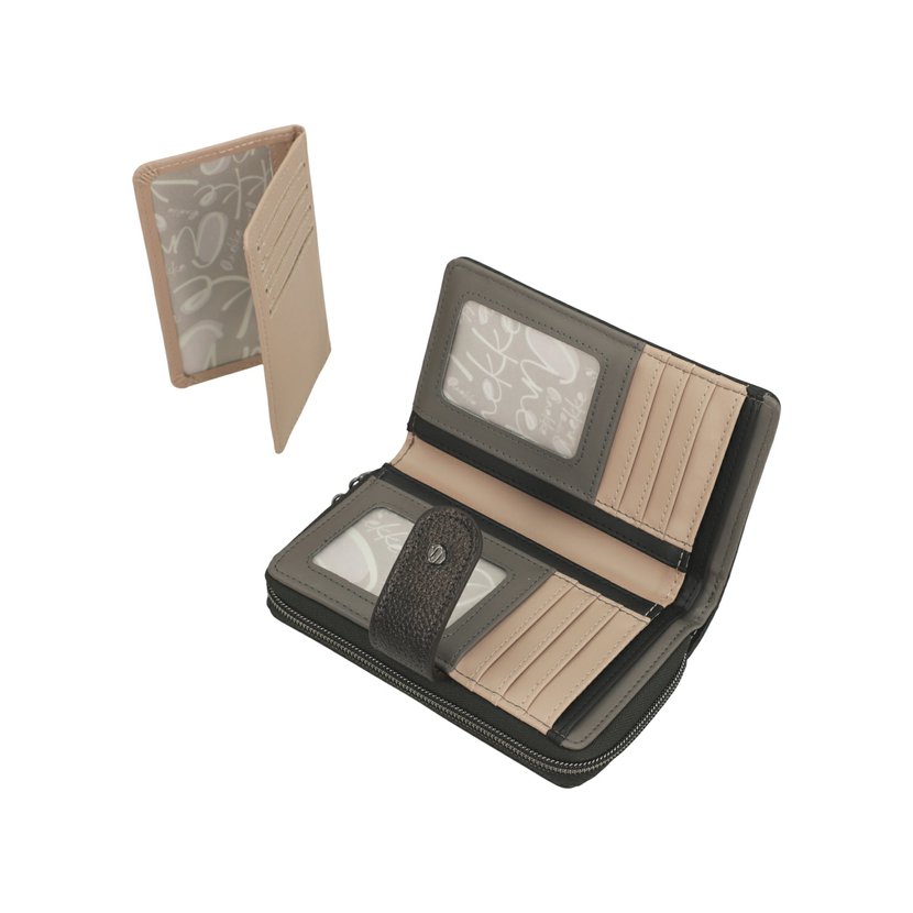 Středně velká peněženka má dva oddíly. Oddíl na mince se zapíná na zip. Oddíl na bankovky a karty se zapíná na druk. Uvnitř tohoto oddílu jsou 2 přihrádky na bankovky, 4 přihrádky na doklady a 8 záložek na karty (2 záložky jsou průhledné). V peněžence je dále vyndavací pouzdro, ve kterém je dalších 6 záložek na karty (2 záložky jsou průhledné). Peněženku dodáváme v originální krabičce.