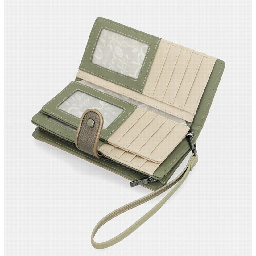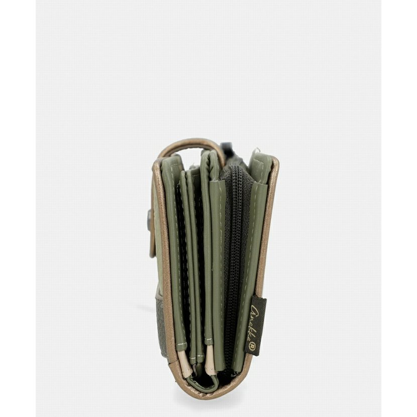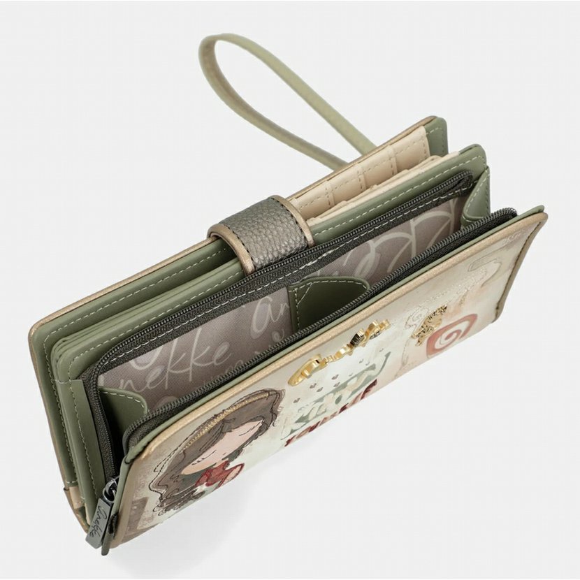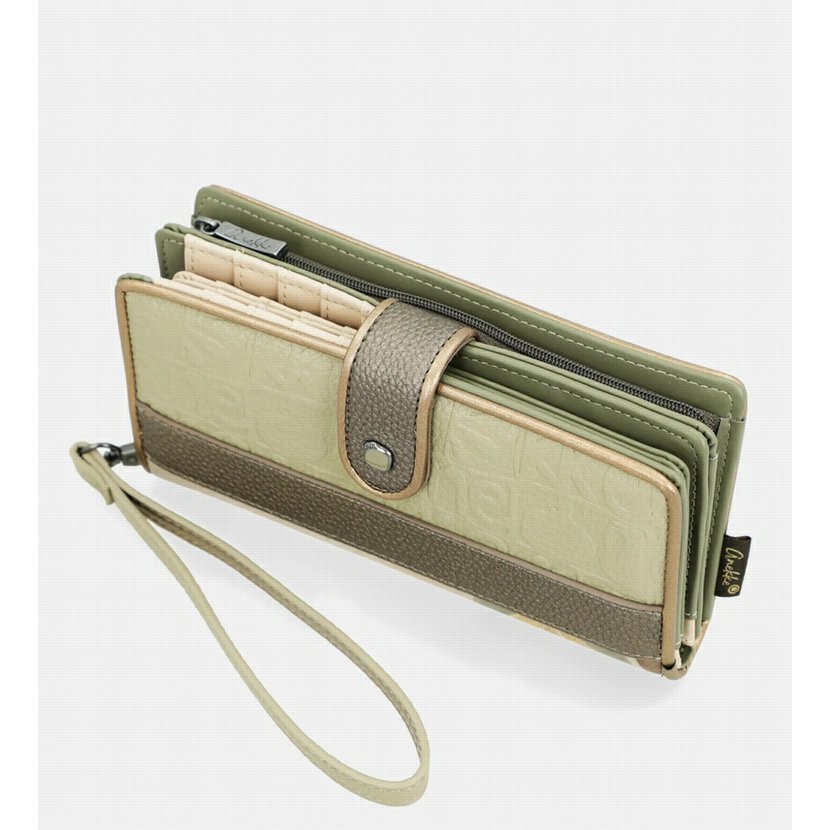 Větší peněženka má dva oddíly. Oddíl na mince se zapíná na zip. Oddíl na bankovky a karty se zapíná na jeden ze dvou druků (podle naplněnosti peněženky). Uvnitř tohoto oddílu je přihrádka na bankovky, 6 přihrádek na doklady nebo papíry a 20 záložek na karty (4 záložky jsou průhledné). U peněženky je odnímatelné poutko na zápěstí. Peněženku dodáváme v originální krabičce.