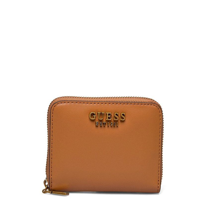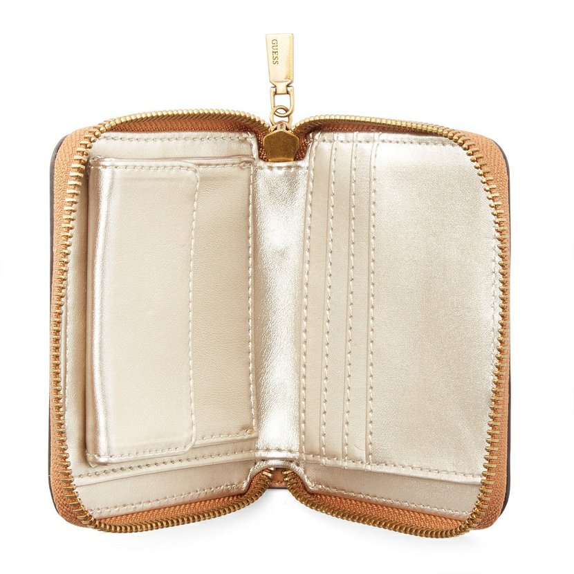 Malá peněženka má zip ze tří stran. Uvnitř peněženky je kapsička na mince na druk, přihrádka na bankovky a 4 záložky na karty. K peněžence je originální krabička Guess.