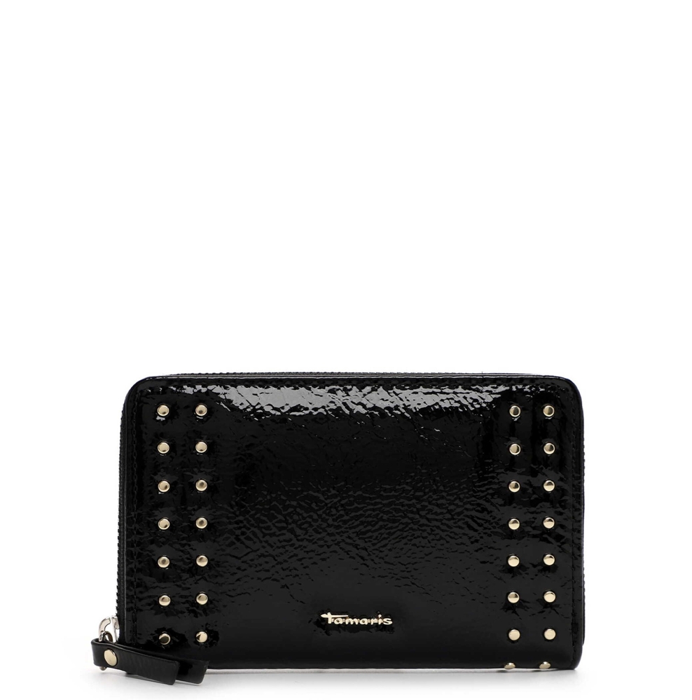 Středně velká peněženka má zip ze tří stran. Uvnitř jsou 4 přihrádky na bankovky, zipová kapsička na mince, 6 záložek na doklady a 6 záložek na karty. Kovové komponenty mají stříbrnou barvu. Na přední straně je logo Tamaris.
