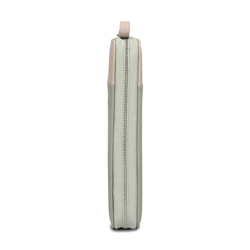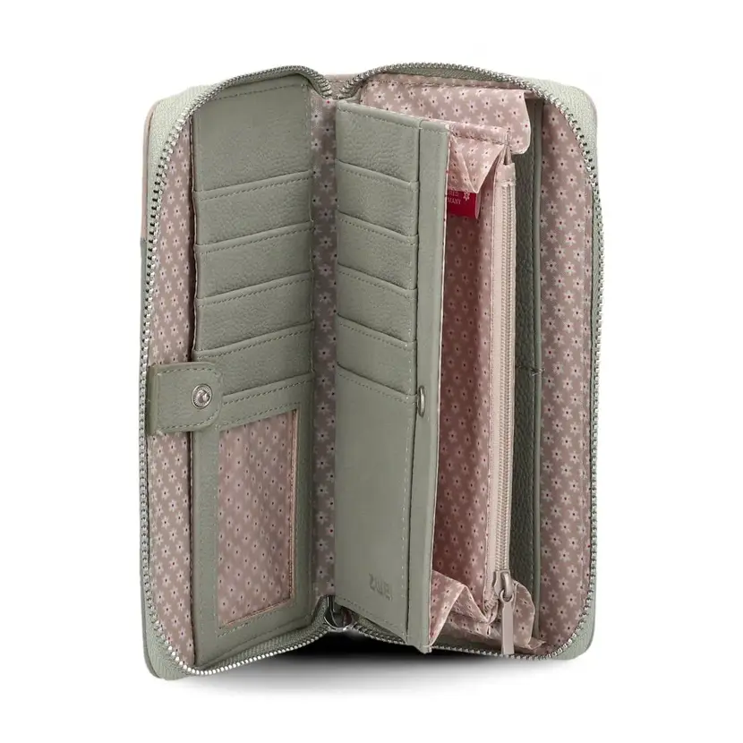 Peněženka má zapínání na zip, který se rozepíná do tří stran. Uvnitř peněženky jsou dvě přihrádky na bankovky oddělené přepážkou, ve které je zipová kapsička na mince. Uvnitř kapsičky je malá záložka, kam lze vložit žeton na nákupní vozík. Uvnitř jedné z přihrádek na bankovky je dále šest záložek na karty. Uvnitř peněženky je další samostatný oddíl se zapínáním na druk. Zde je dalších 10 záložek na karty (jedna ze záložek je průhledná) a další kapsa na doklady nebo papíry. Barevný vnitřek peněženky (z polyuretanu) má stejnou barvu, jako je převažující materiál vnější části peněženky. Podšívka z polyesteru (s kytičkami) je u všech peněženek stejná. Peněženka je balená v bílé papírové krabičce.