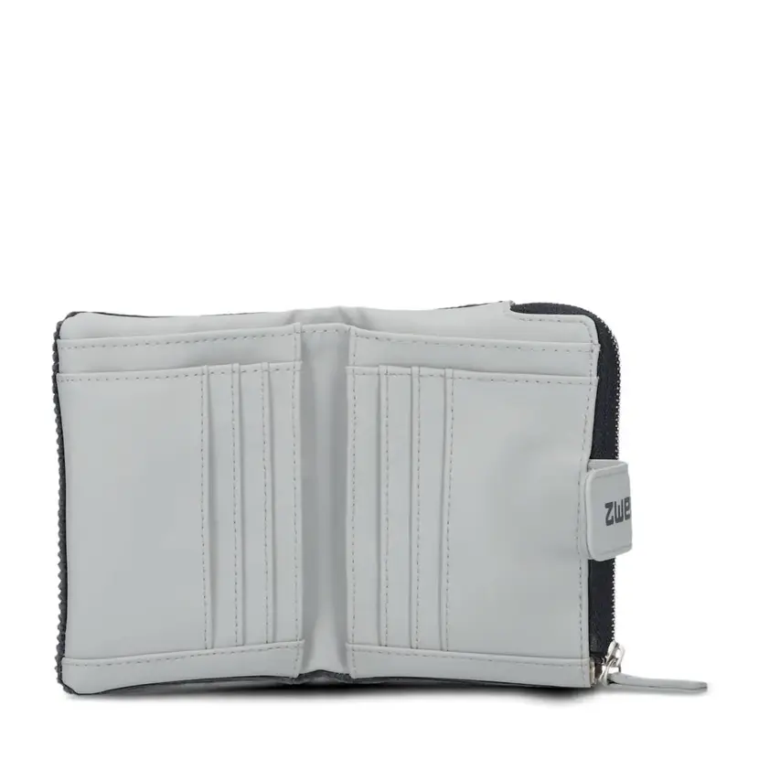 Elegantní středně velká peněženka má zapínání na druk. Uvnitř peněženky je přihrádka na bankovky, 4 záložky na doklady a 6 záložek na kreditní karty. Z vnější strany je kapsička na mince se zapínáním na zip. Peněženka je balená v bílé papírové krabičce.