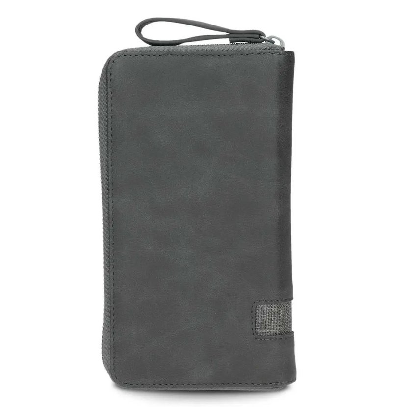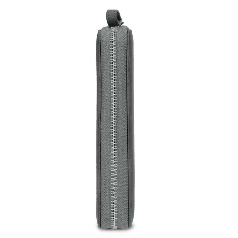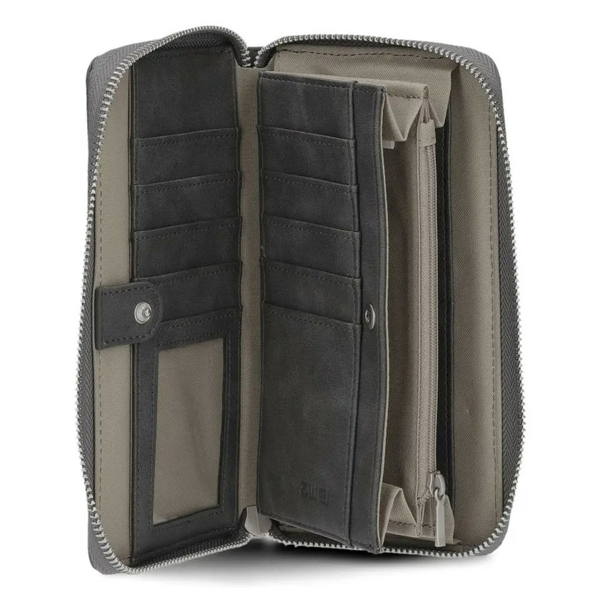 Peněženka má zapínání na zip, který se rozepíná do tří stran. Uvnitř peněženky jsou dvě přihrádky na bankovky a šest záložek na karty. V přepážce je zipová kapsička na mince. Uvnitř kapsičky je malá záložka, kam lze vložit žeton na nákupní vozík. Uvnitř peněženky je další samostatný oddíl se zapínáním na druk. Zde je dalších 10 záložek na karty (jedna ze záložek je průhledná) a další přihrádka na doklady nebo papíry. K peněžence je značková krabička.