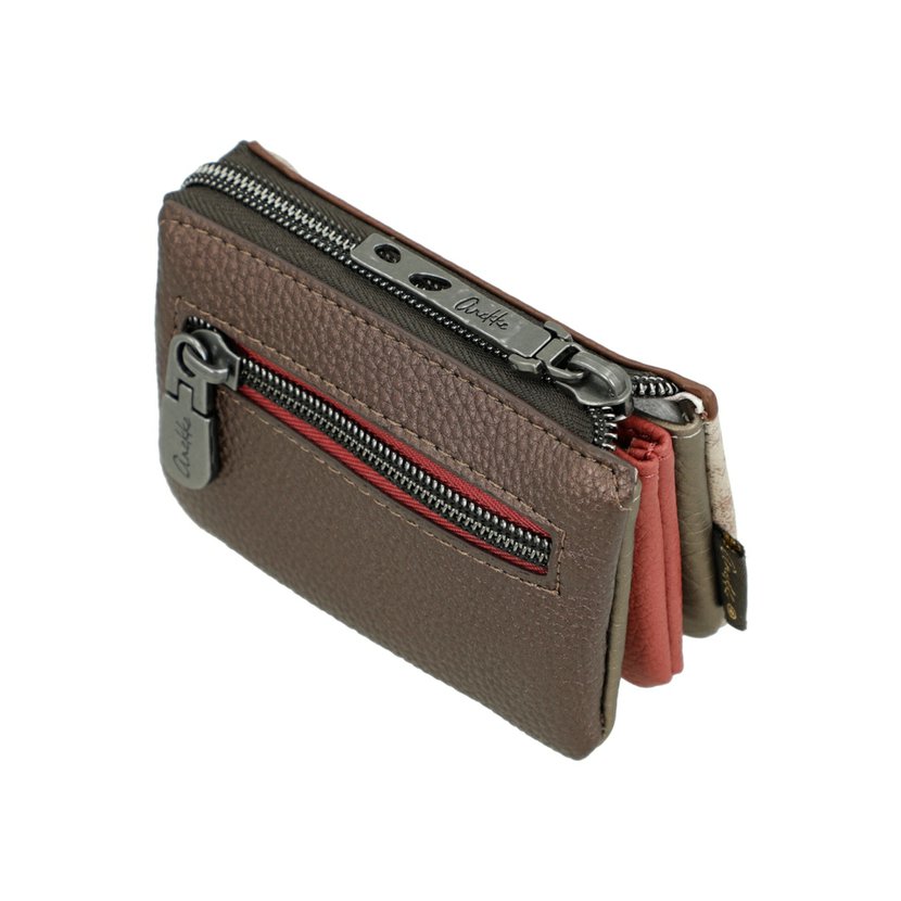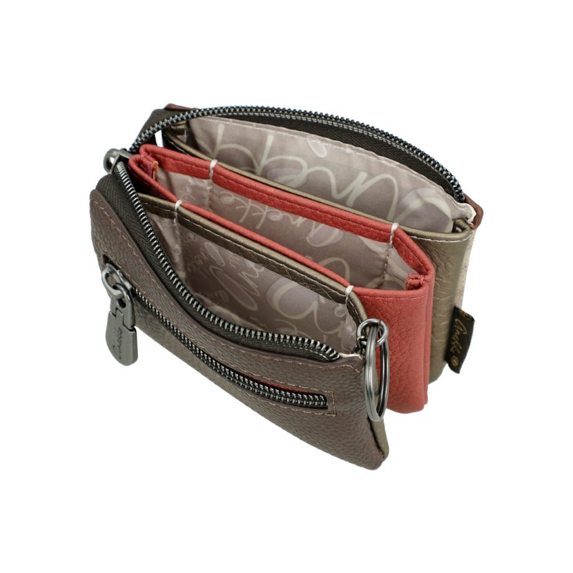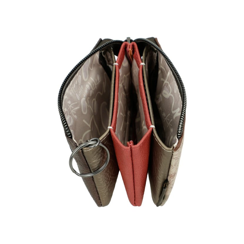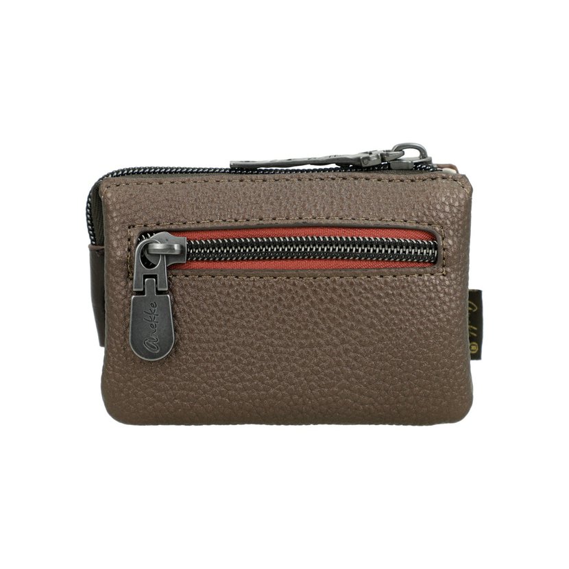 Pouzdro na doklady nebo mince má tři komory a zapínání na zip. Na zadní straně je kapsička na zip.
